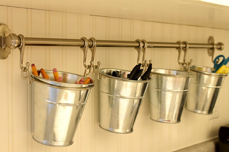 Puede parecer obvio, pero no sobra recordar que bolígrafos y otros útiles de escritorio deben tener contenedores específicos. Por ejemplo, botes, que incluso puedes colgar en un barra que pongas en la pared de enfrente de tu mesa de trabajo.