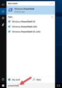 - Escribe «PowerShell» en el buscador de Windows (parte inferior izquierda, al lado del logo de Windows).