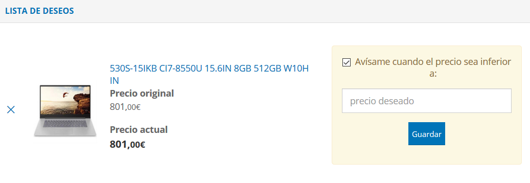 Con la herramienta de la lista de deseos, puedes activar el Avisador de precio para cada uno de tus productos favoritos. Lo único que tienes que hacer es determinar un precio: cuando el precio del producto esté por debajo de ese umbral, ¡te avisamos! Recibirás un mensaje en la cuenta de correo electrónico asociada a tu cuenta de beep.es
