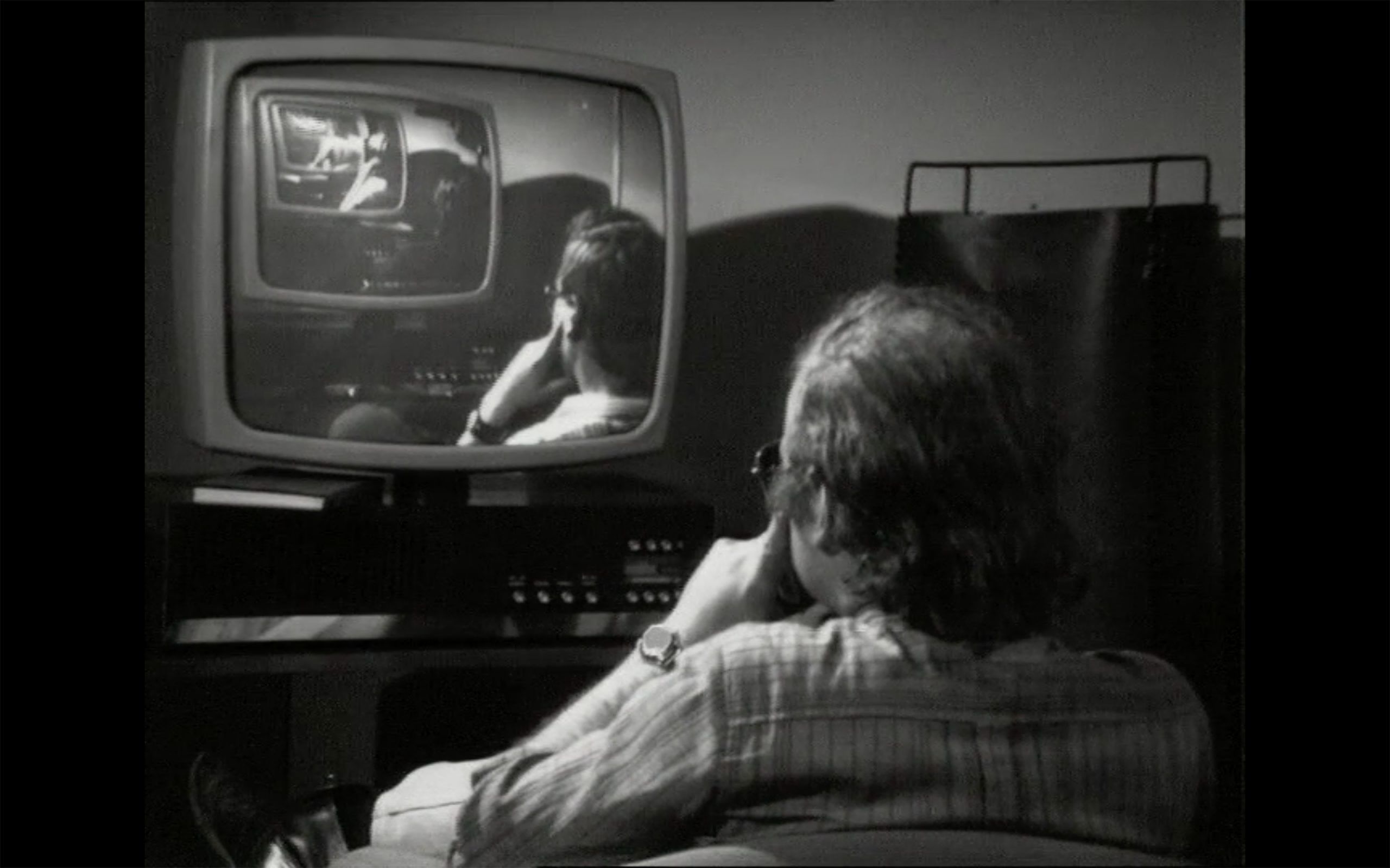 «Entre el televisor y el espectador, existen una función y una acción que le permiten encender y apagar el aparato. El artista ha reproducido esta función y la ha convertido en el contenido de un programa de televisión. En la pantalla, se ve una secuencia de espectadores sentados frente a su televisor. Al producirse un fallo en un televisor, el espectador debe levantarse para repararlo. Esta reparación provoca una interrupción en la pantalla del siguiente espectador, que se propaga hasta llegar al espectador y al televisor real. Ello significa que finalmente el espectador real tiene que levantarse y eliminar el problema. La obra, creada en 1969, materializa el desfase temporal, poniendo en relación el procedimiento real y el procedimiento reproducido«.